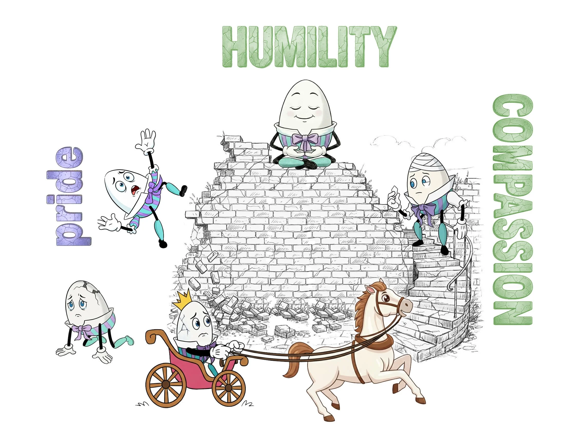 Pride wants to be the greatest and falls from Virtue when he doesn't get his way. If an egg only considers one aspect of whatever label hit him (or that he created himself), then he will only consider himself, and he will fall into judgment swiftly (e.g., the shorter his wall, the quicker his fall)... But the more aspects of reality that he holds with Compassion and Humility, the less he thinks of himself and the more he considers others. The taller Humpty sits, the more healthy and whole he will be...